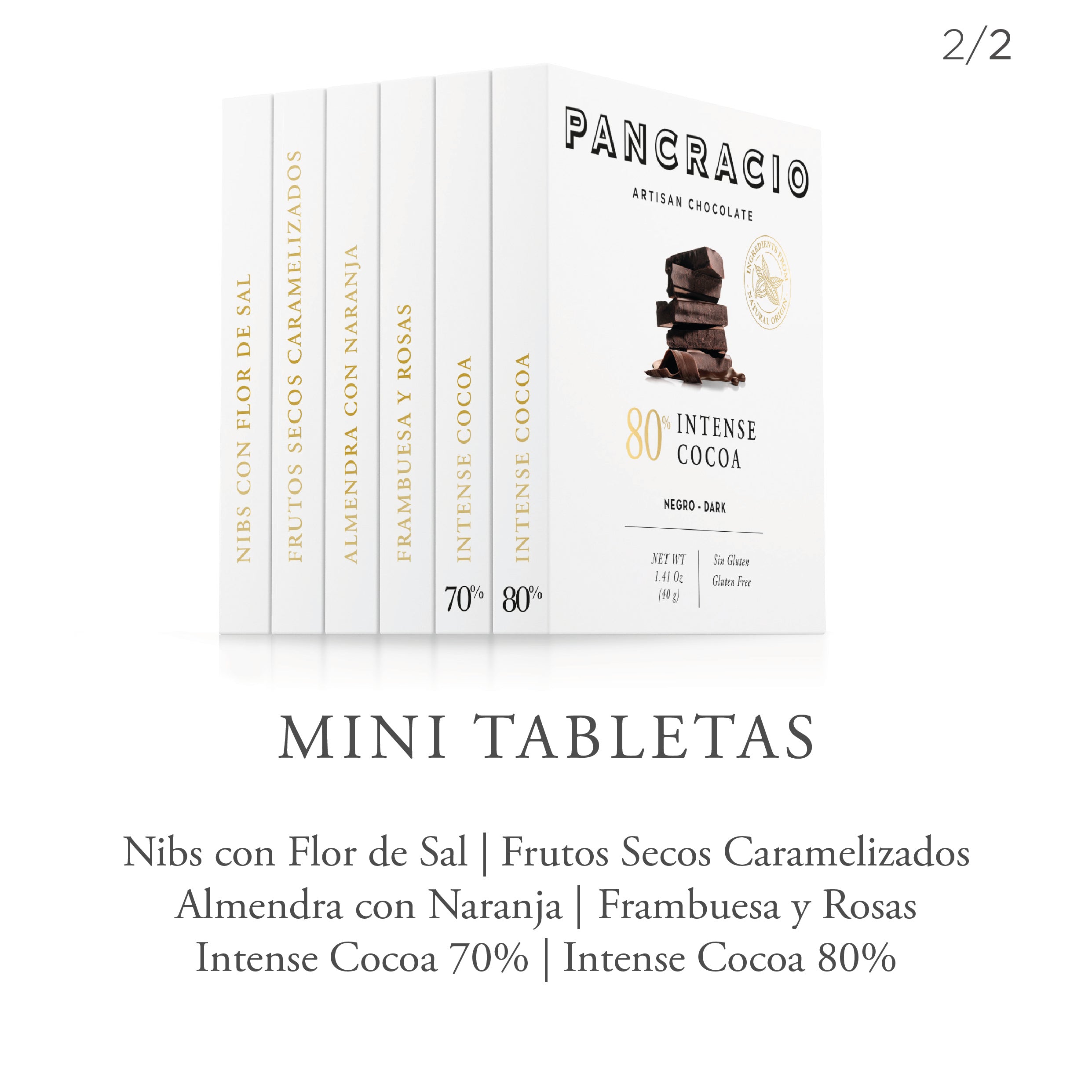 6 Mini Tabletas: Nibs con Flor de Sal, Frutos Secos Caramelizados, Almendra con Naranja, Frambuesa y Rosas, Intense Cocoa 70%, Intense Cocoa 80%.
