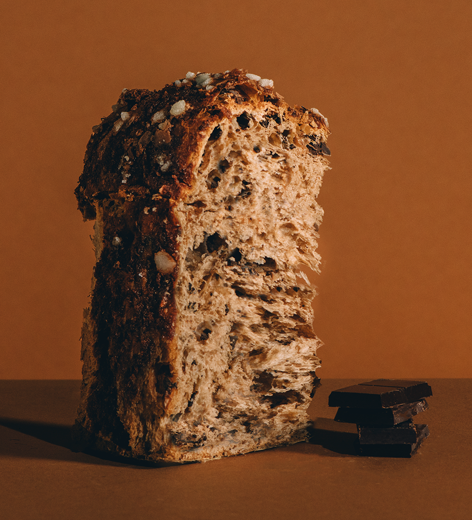 El sabor suave y la esponjosa textura del brioche contrastan con la intensidad de las pepitas y la cobertura de chocolate.
